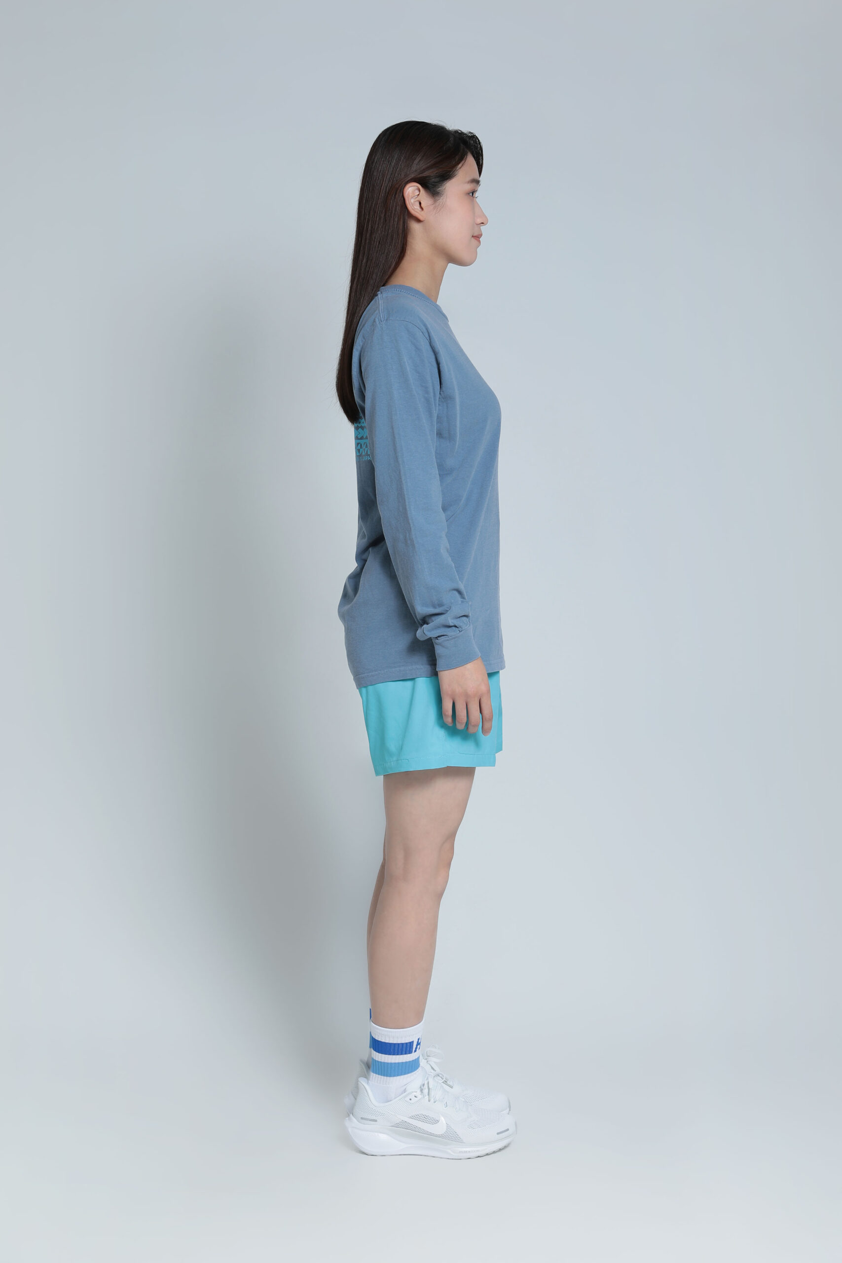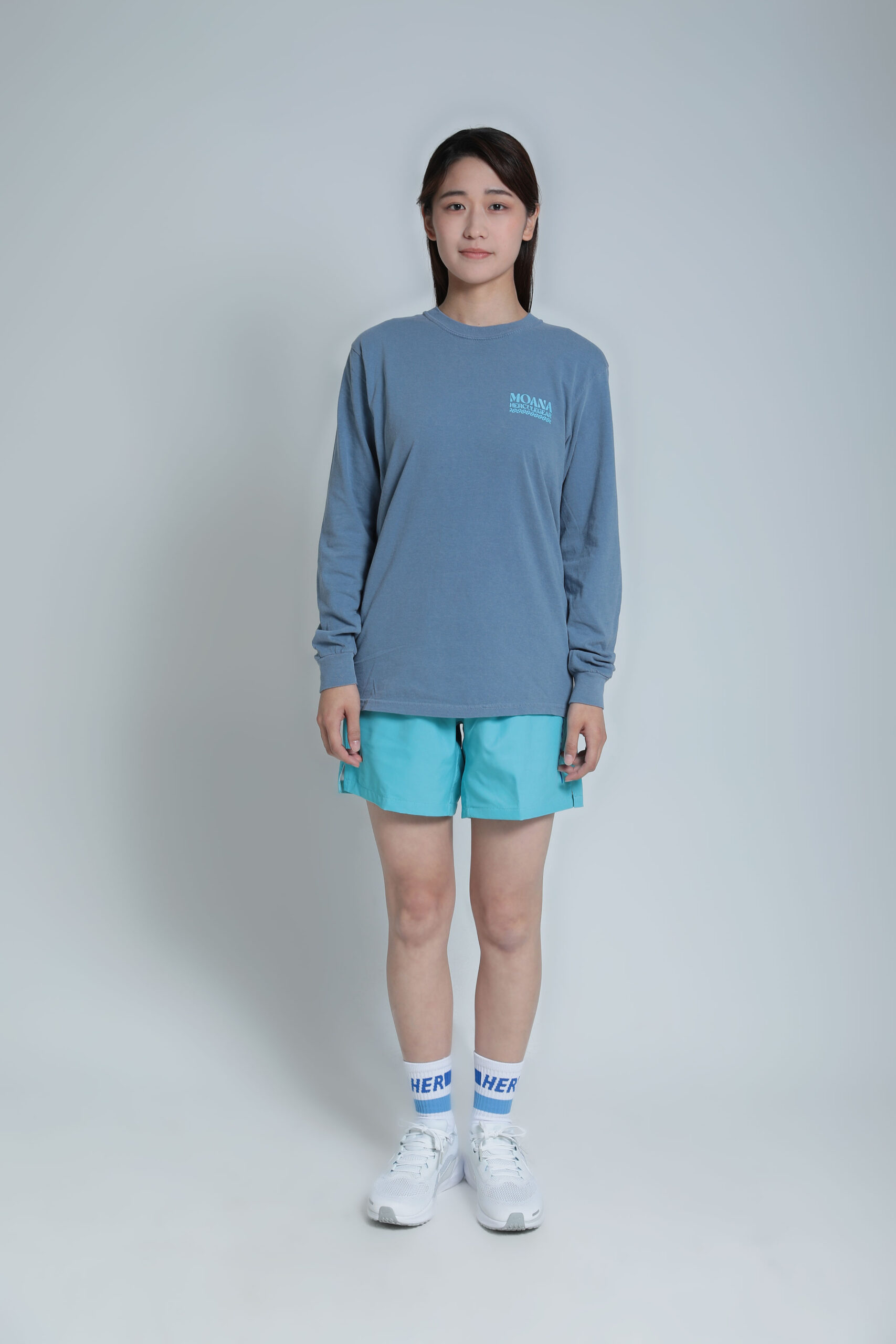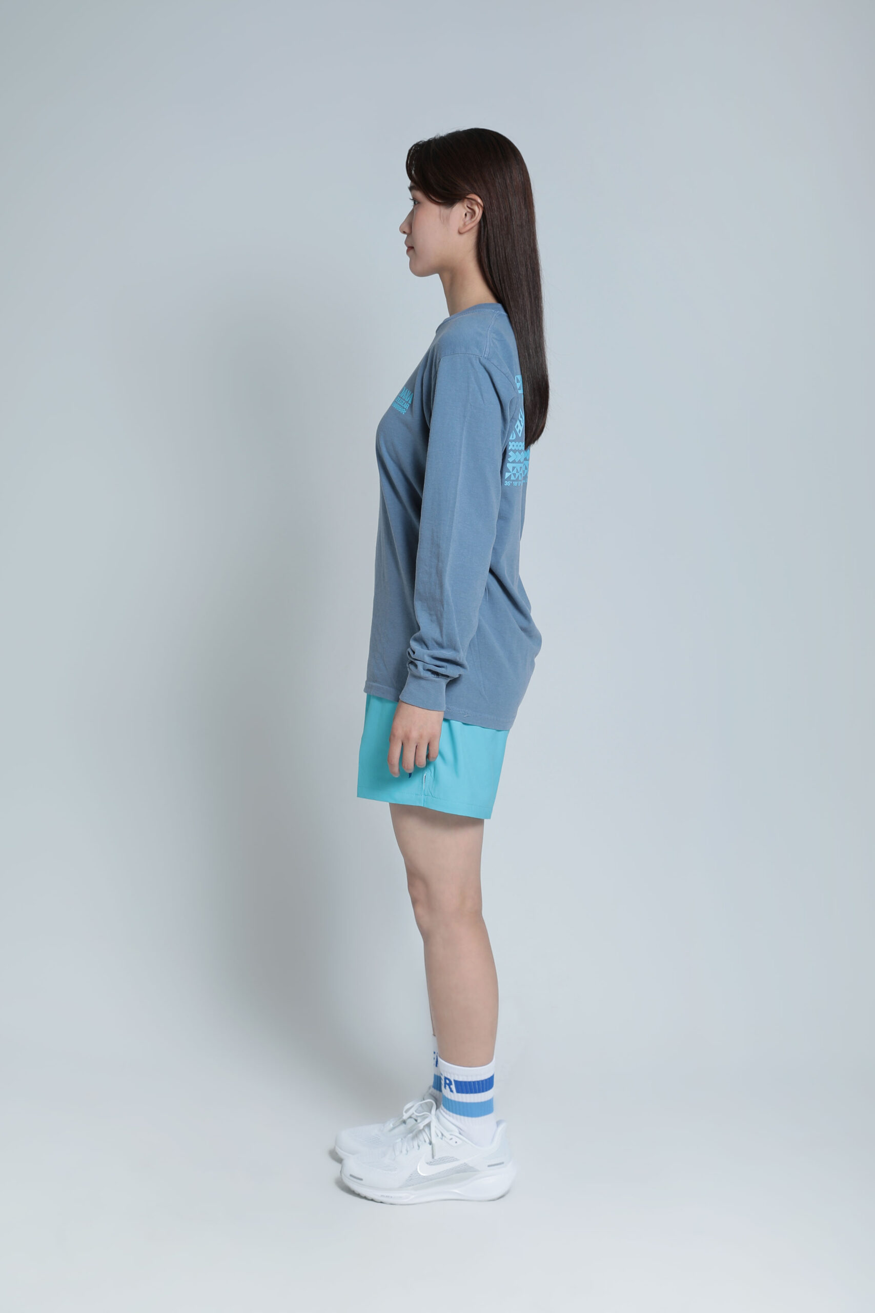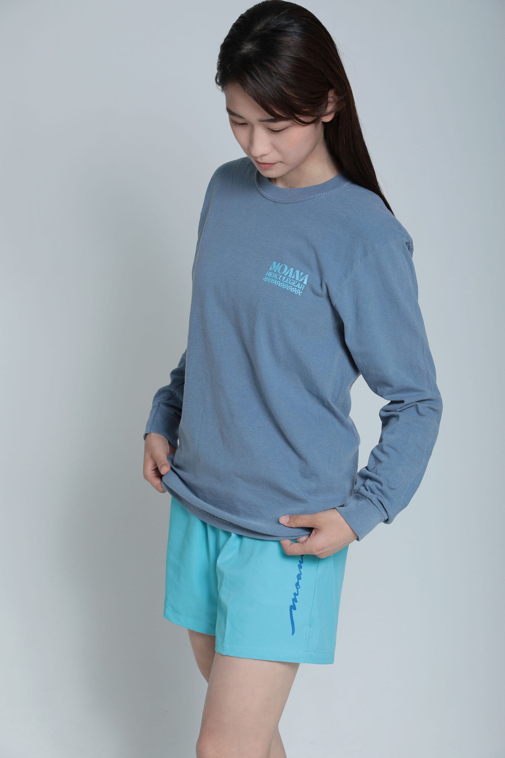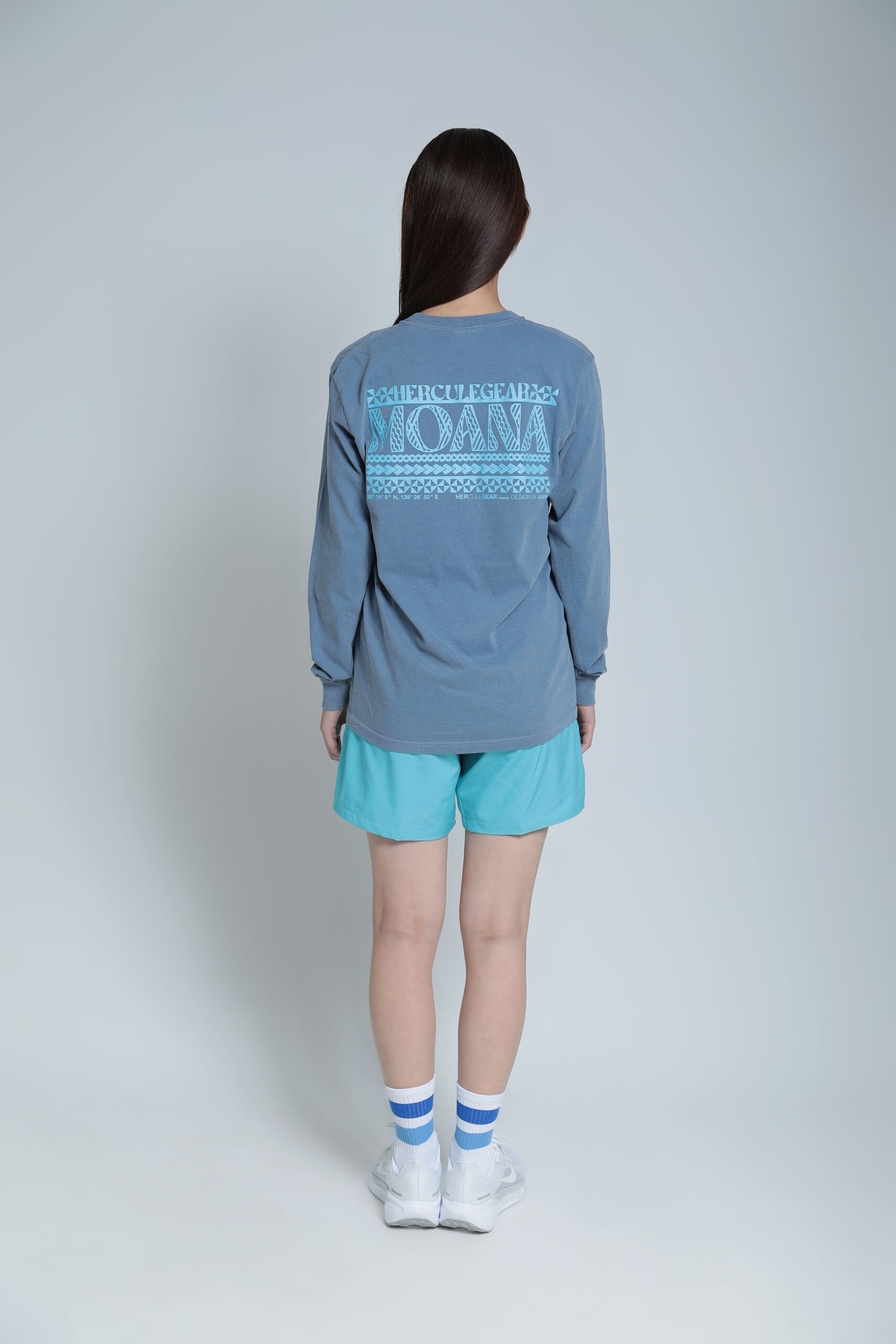 海を感じさせる落ち着いたブルーグレーに、ポリネシアンパターンをベースにしたグラフィックをプリントしたロングスリーブTシャツ。